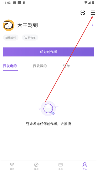 2、在个人界面点击右上角三条横线图标,展开侧边栏的功能选项列表。