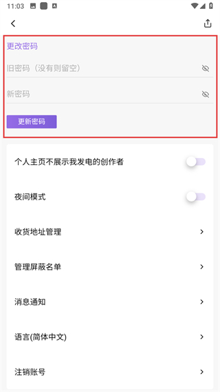 4、在设置页面找到更改密码区域,填写信息后点击更新密码完成修改。