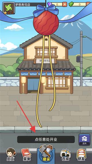1、在【梦想寿司店】界面,点击【点任意处开业】按钮,开启店铺经营流程。