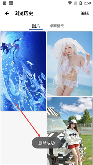 3、在编辑模式下,选择要删除的浏览历史图片,点击底部【删除】按钮。