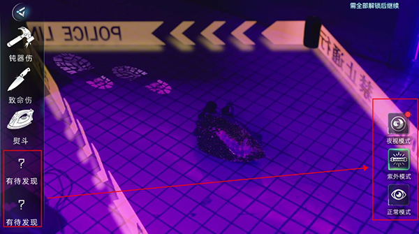 2、在逼真的场景中需要找到很多的线索,使用模式道具进行寻找,对游戏后期是有很大的帮助的,在不同的场景中会有不同的模式可以切换;
