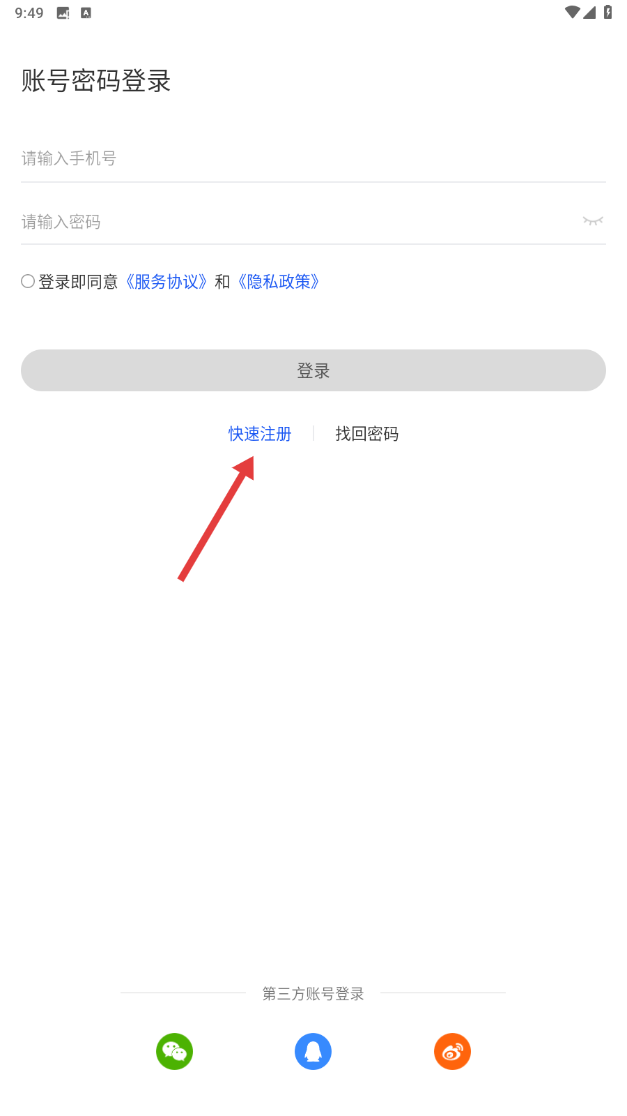 1、打开国家反诈中心App后,在账号密码登录界面,点击【快速注册】哦。