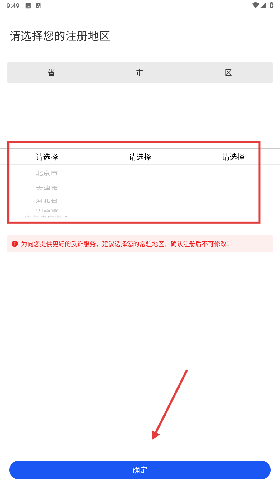 2、接着进入选择注册地区页面,依次选择省、市、区,选好后点击下方【确定】按钮就行啦。