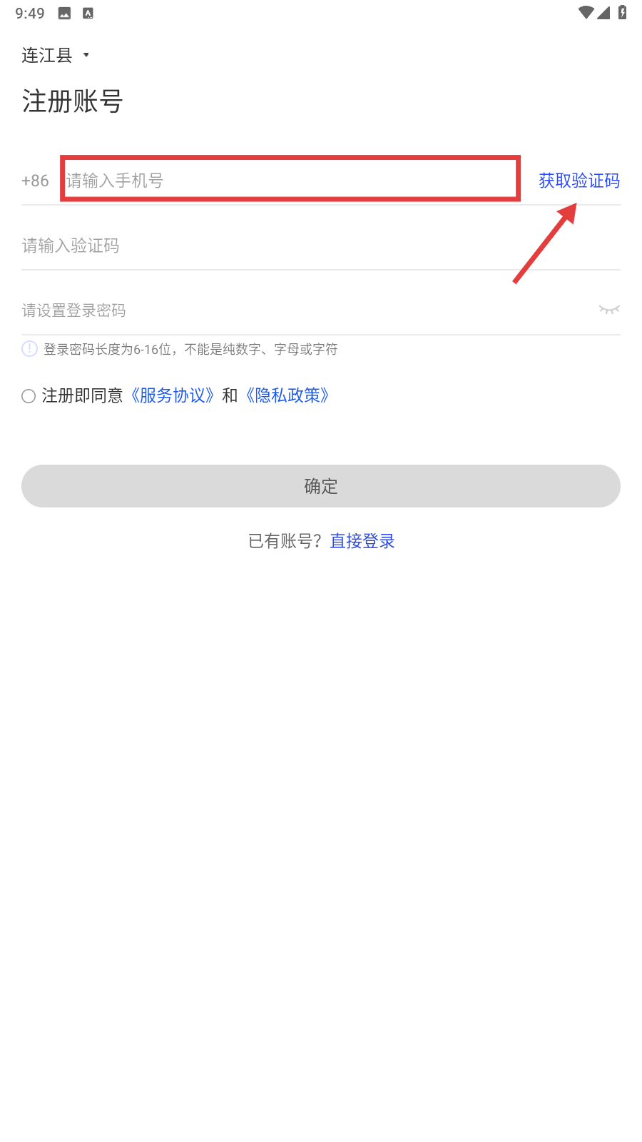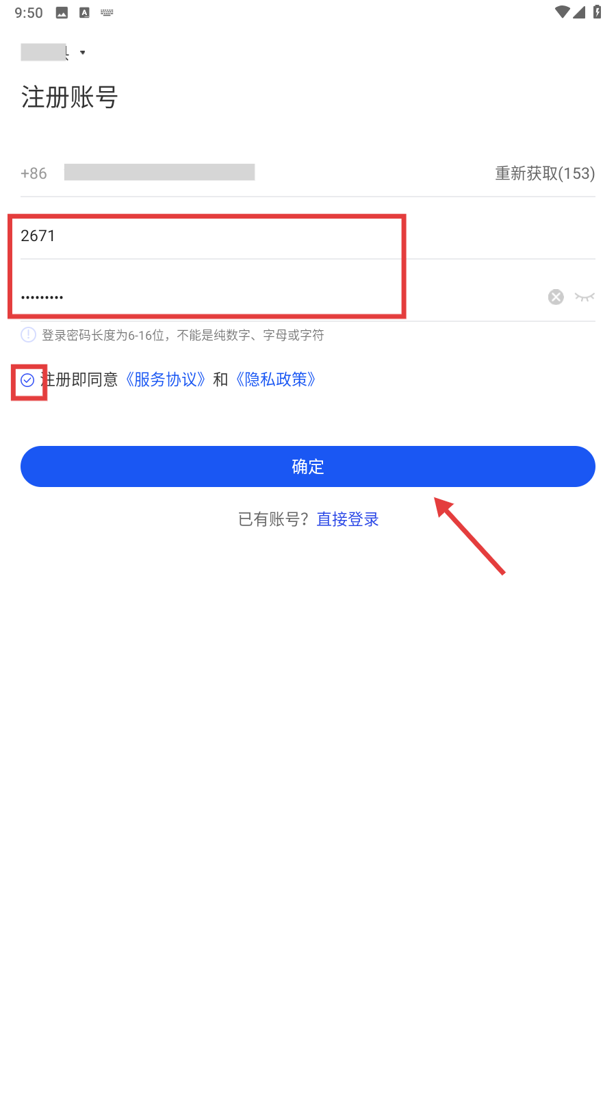 4、最后输入收到的验证码,设置符合要求的登录密码,勾选同意条款,点击【确定】,就能完成注册啦。