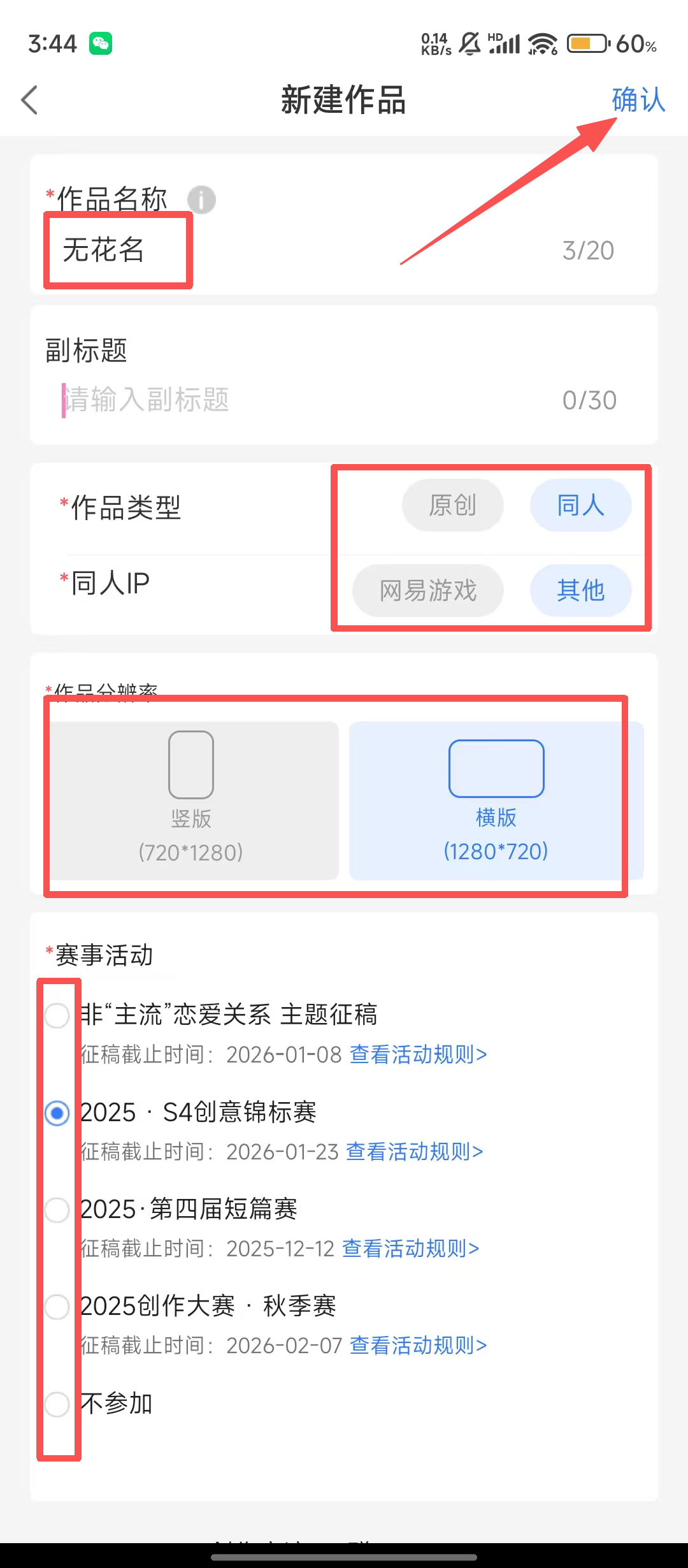 2、在新建作品页面,填写【作品名称】、选择类型等信息后,点击【确认】,就能进入下一步啦。