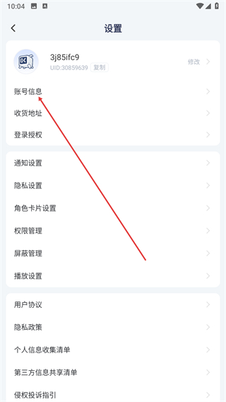 2、在设置页面,点击账号信息选项。