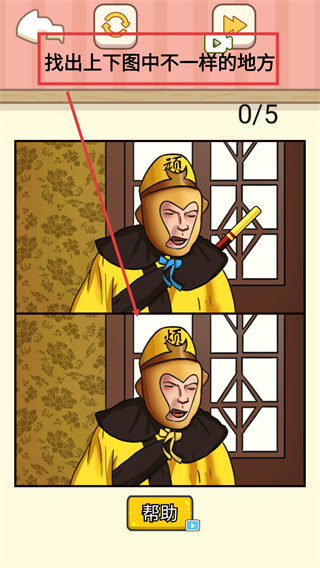 1、进入找不同关卡后,先观察【孙悟空】的【帽子-頑】与【领巾-蓝色】,对比上下图细节差异开启挑战。