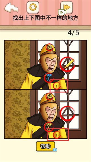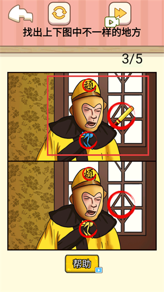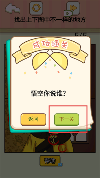 3、进度4/5时,检查【孙悟空】的【服装-黄色】与背景细节,找出最后一处不同完成关卡。