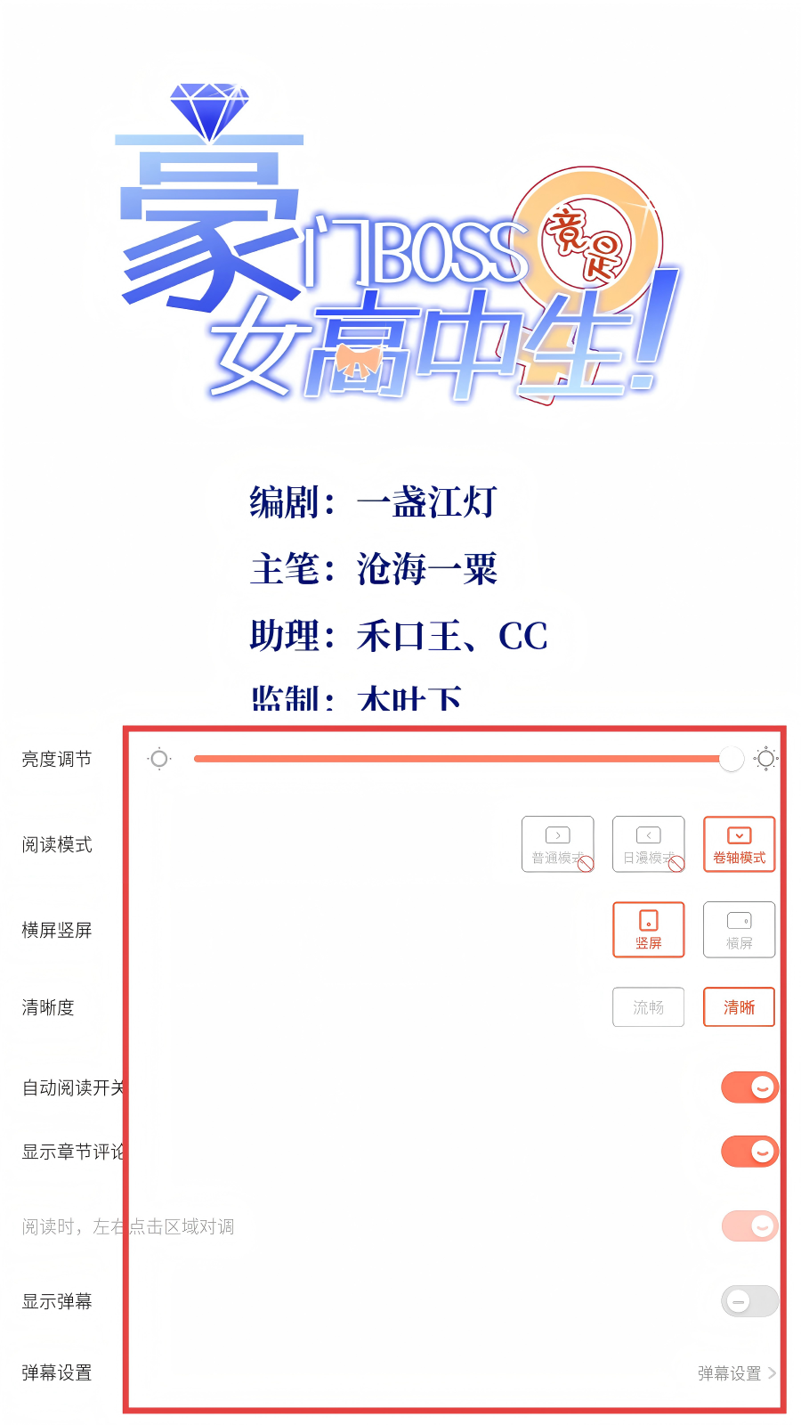 4、还可通过设置调整【亮度调节】等,选【卷轴模式】等画质,还能开关自动阅读、弹幕等,定制专属阅读体验哦。