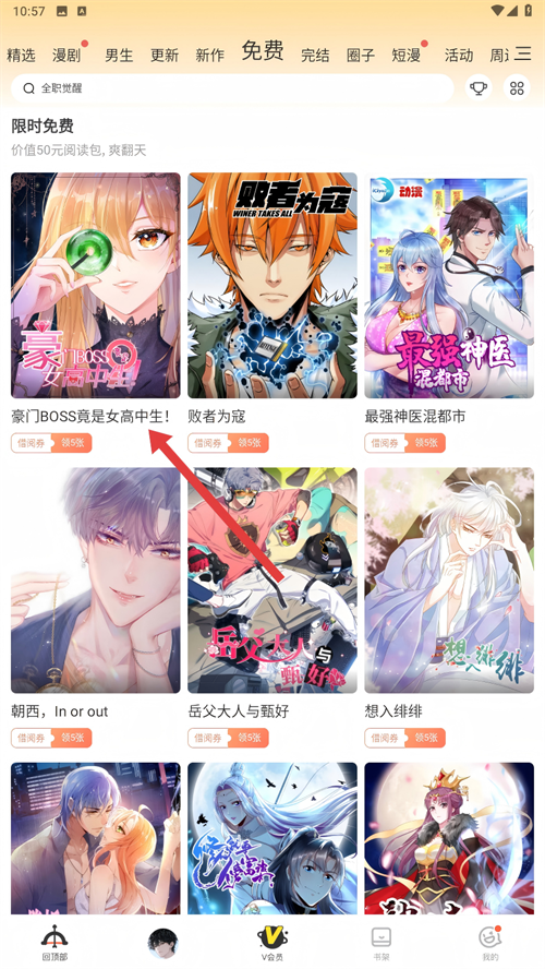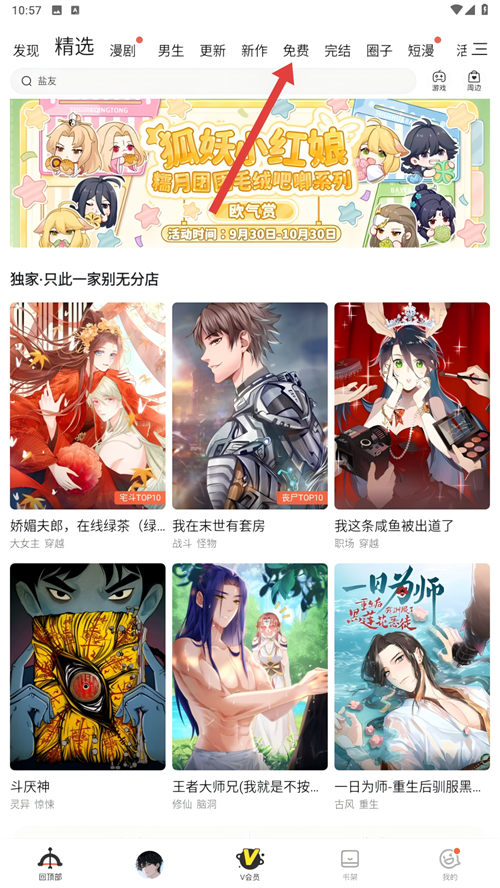 1、点击顶部【免费】标签,进入免费漫画专区,这里有众多免费漫画可供选择,轻松实现漫画自由啦。