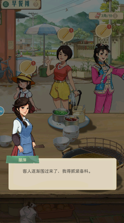 6、早餐摊开业成功,吸引第一批客人到来,标志着经营之路的开始。