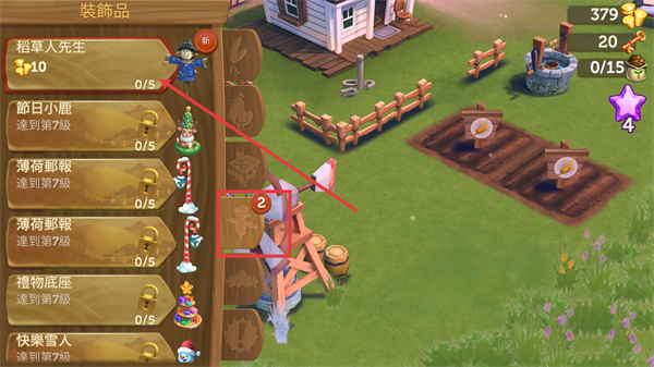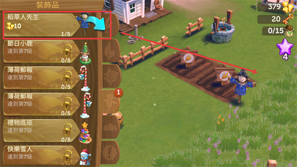 2、在装饰菜单中找到【稻草人先生】,消耗10金币即可解锁该装饰,用于美化农场的土地区域。