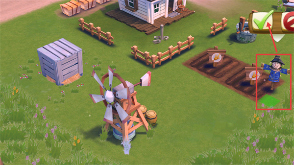3、将解锁的【稻草人先生】拖动到农田旁的绿色区域,点击确认按钮完成装饰布置。