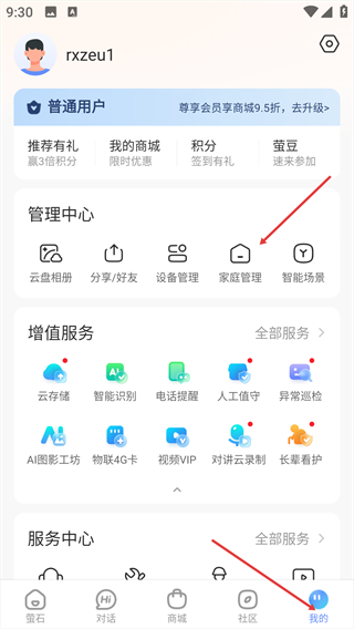 1、进入【我的】页面,在【管理中心】找到【家庭管理】功能。