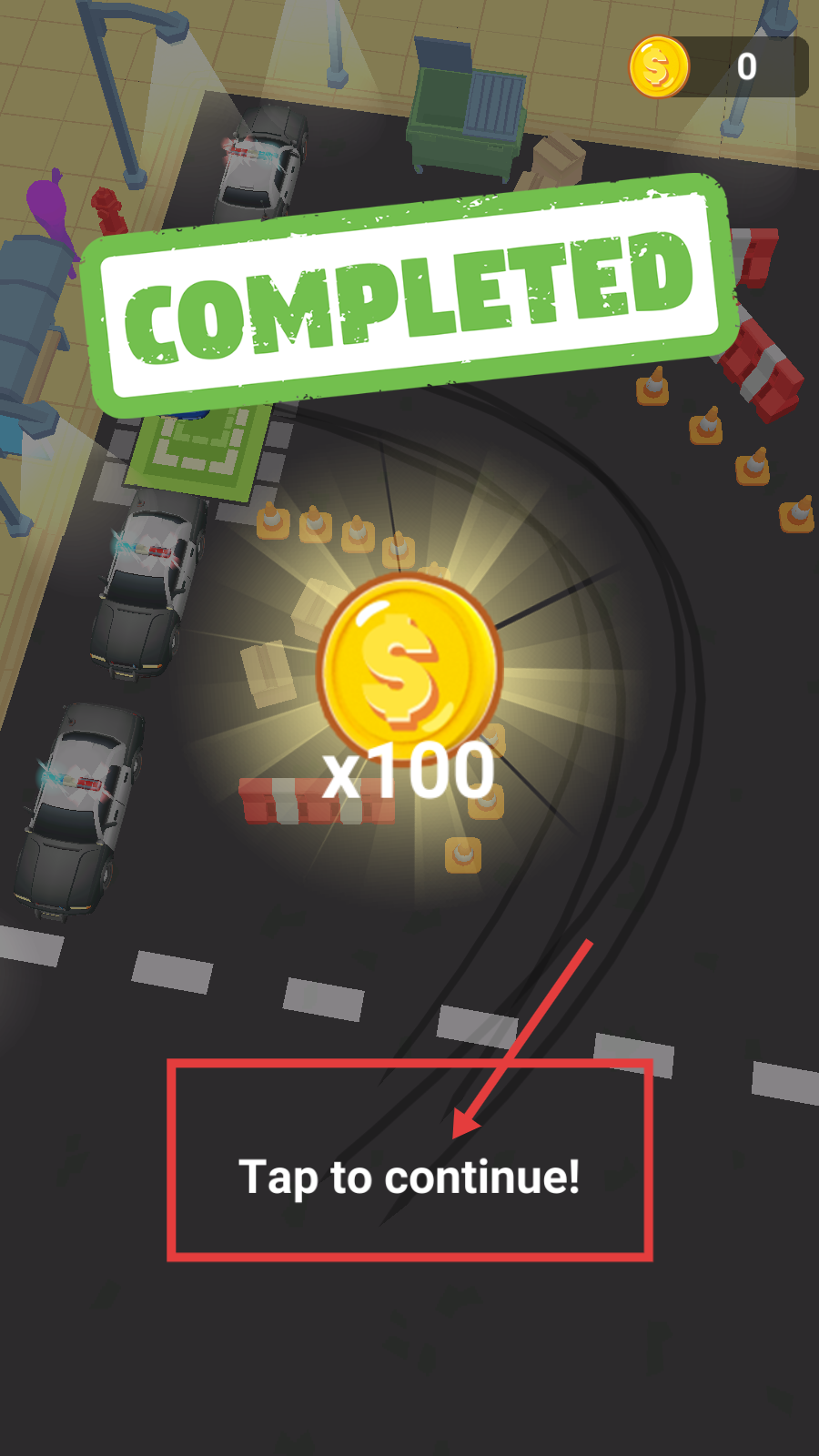 4、成功停车后,界面显示【COMPLETED】,点击【Taptocontinue!】继续游戏。