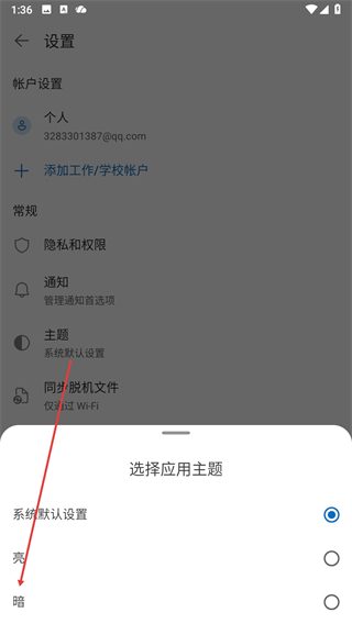 4、在选择应用主题菜单中找到暗选项,点击对应的单选按钮。