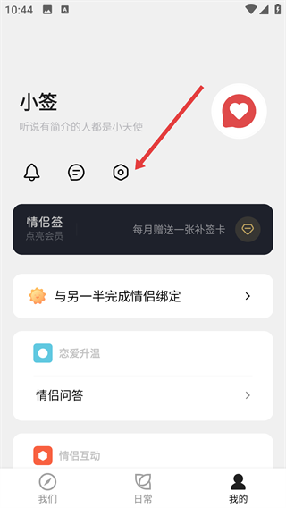 1、在情侣签【我的】页面,点击图标,进入设置相关入口呢。