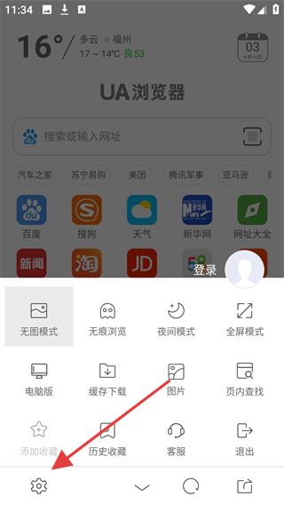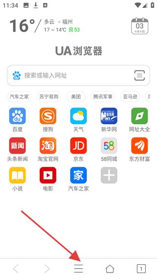 1、打开UA浏览器首页,点击底部【三横线】菜单按钮,展开功能选项。