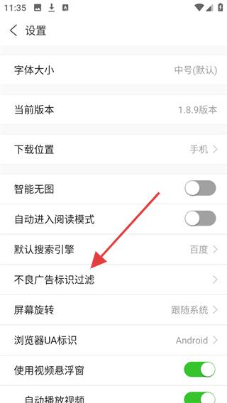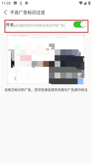 4、开启“不良广告标识过滤”的开关,即可启用广告过滤功能减少广告显示。