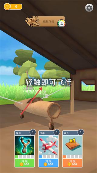 1、查看初始界面的【纸飞机-1级】,按“轻触即可飞行”提示操作,同时可消耗货币升级【道具】【飞机】等提升能力。