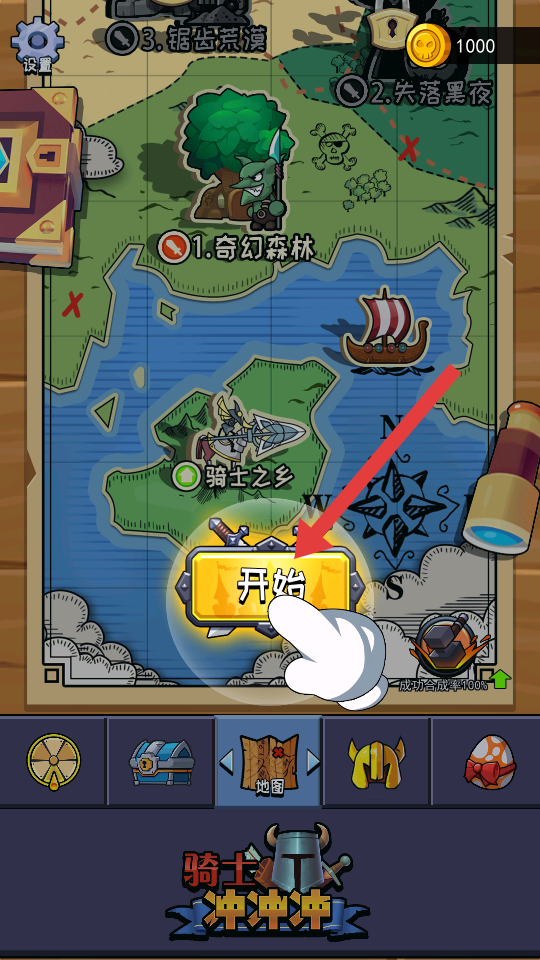 1、在游戏地图界面,点击【开始】按钮,选择关卡,开启【骑士冲冲冲】的冒险之旅。