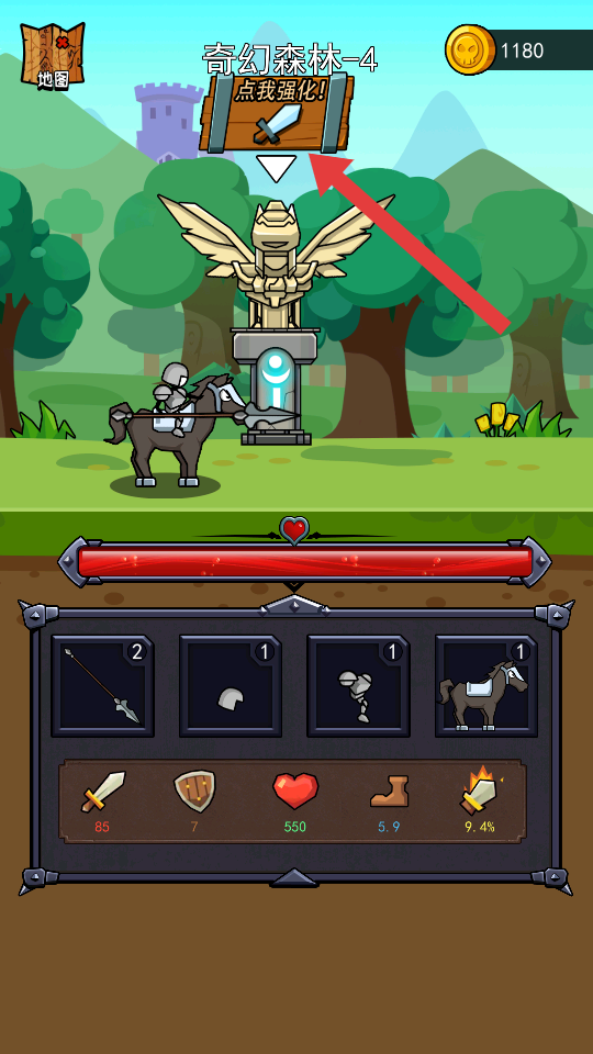 3、在关卡中看到【点我强化!】的提示后,点击此处进入强化界面,提升骑士的战斗能力。