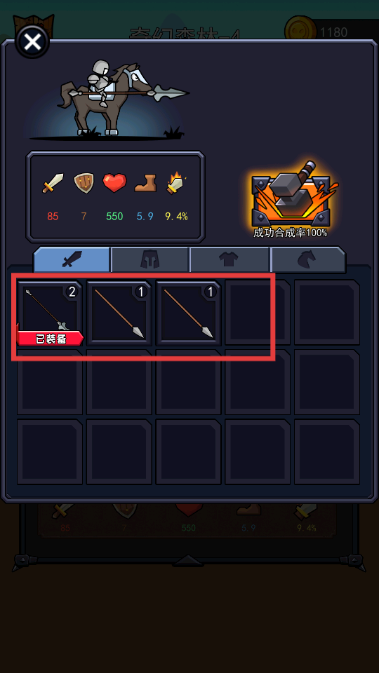 4、在强化界面中,将相同等级的武器进行合成,增强骑士的装备属性。