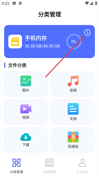 1、在【分类管理】页面,点击【手机内存】区域右上角的箭头按钮。