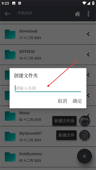 3、选择【新建文件夹】选项,弹出【创建文件夹】的名称输入弹窗。