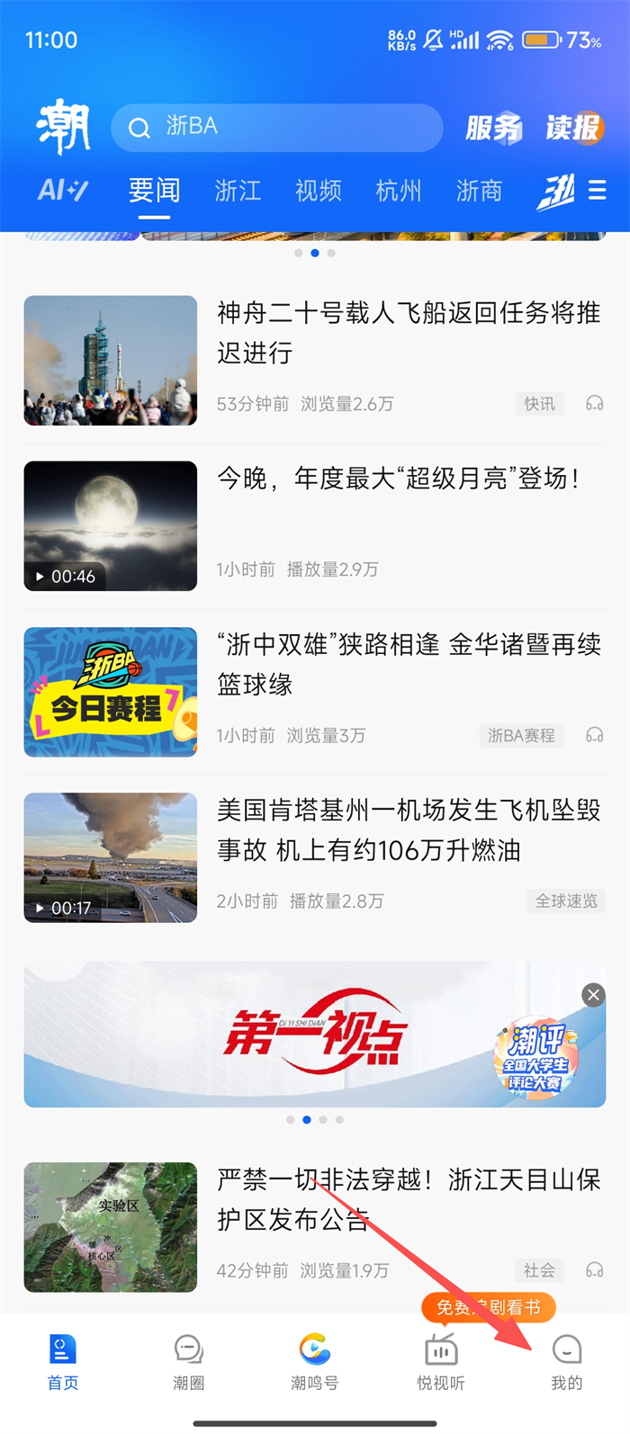 1、打开潮新闻,点击底部【我的】,开启退出账号的操作流程哦。