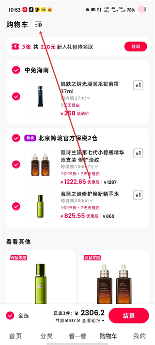 2、在购物车页面点击左上角管理按钮,切换至购物车商品管理状态。