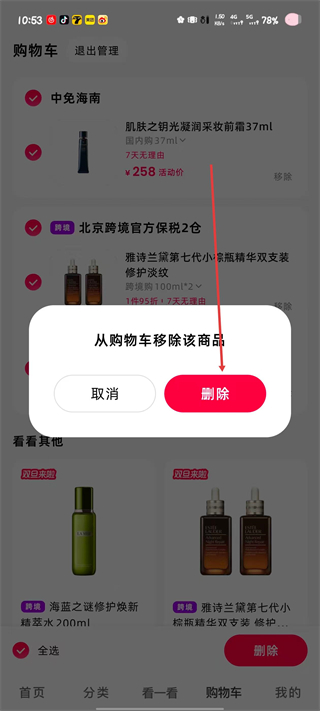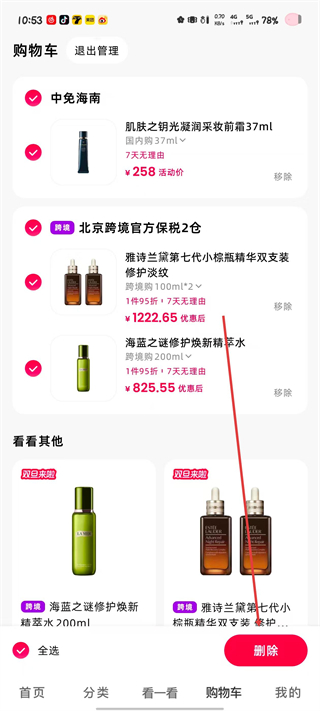3、勾选需要删除的购物车商品,选中后点击页面底部删除按钮。