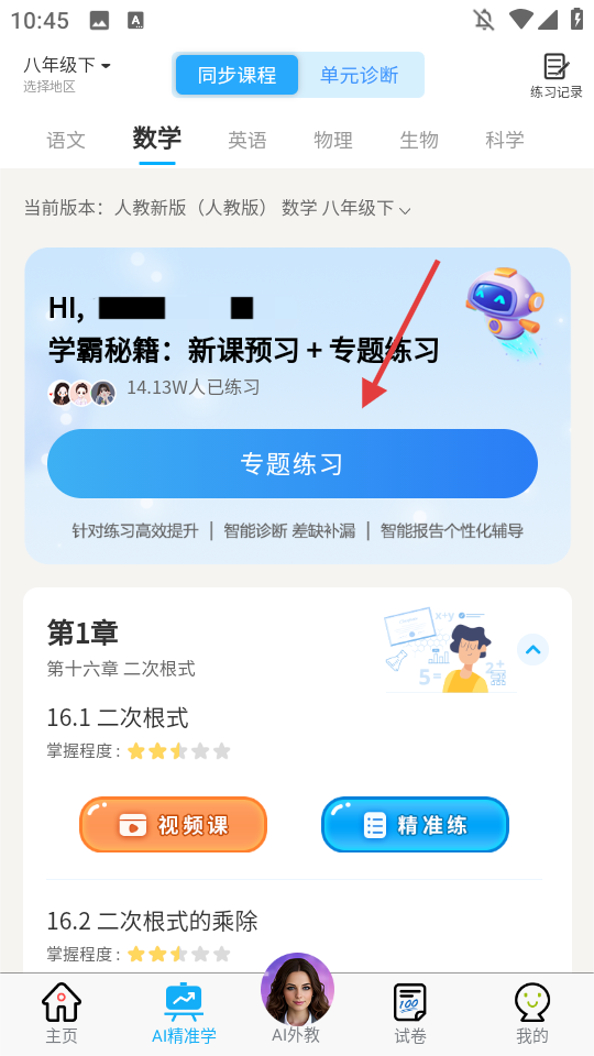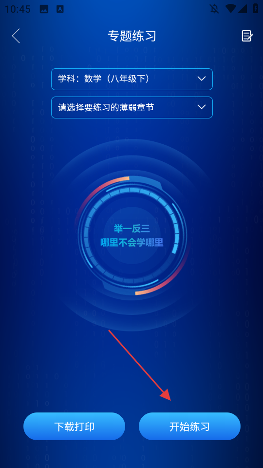 3、选择学科和要练习的薄弱章节,点击【开始练习】。