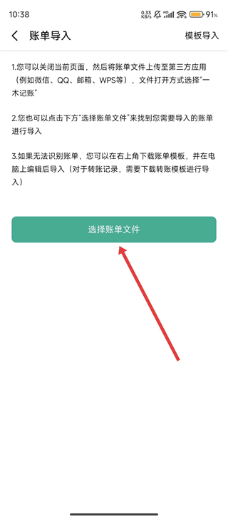 4、在账单导入页,点击【选择账单文件】,挑选好要导入的Excel账单,就能完成导入啦。