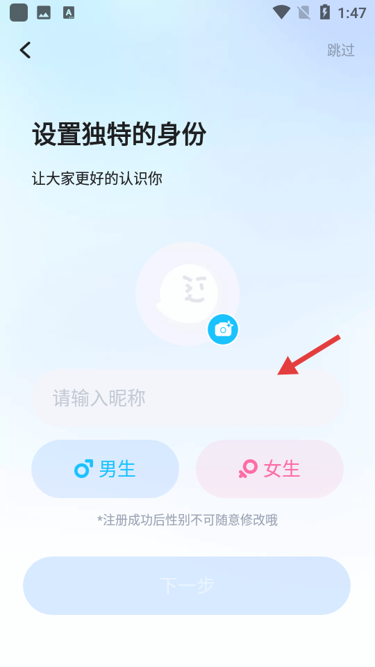 4、进入设置身份页面,输入昵称,选择性别(男生/女生),完成注册操作。