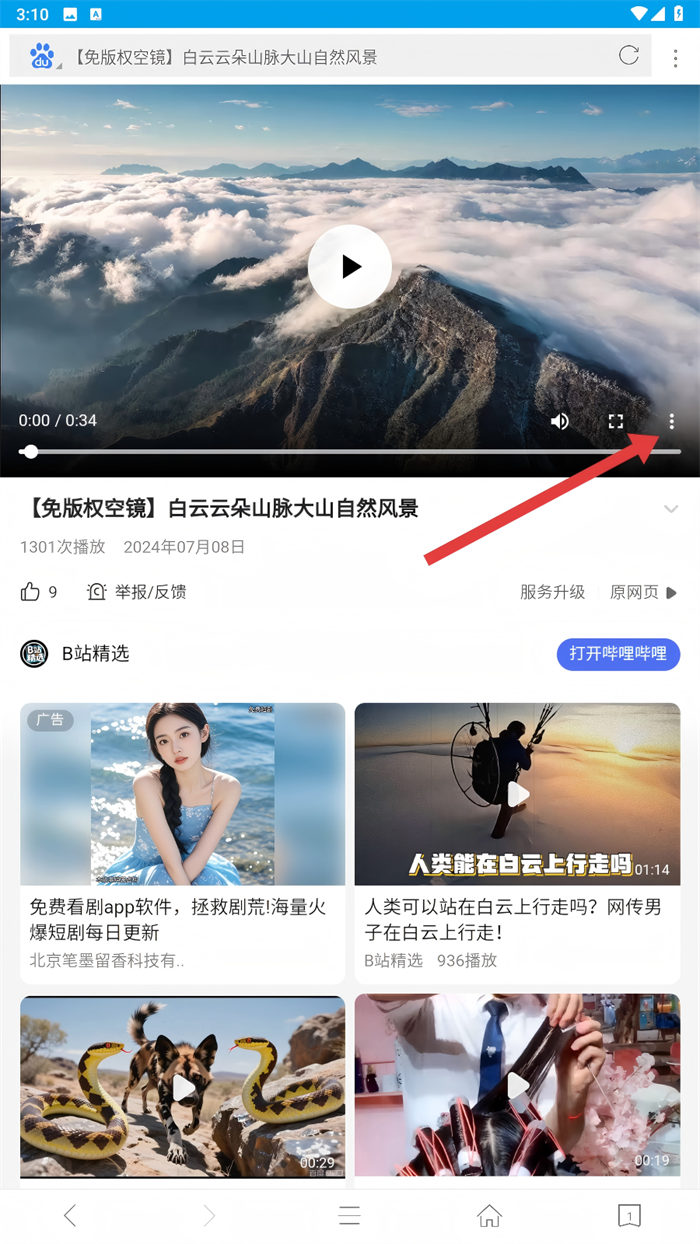 3、在视频播放界面,点击右上角的三个点,调出功能菜单,为缓存做准备呢。
