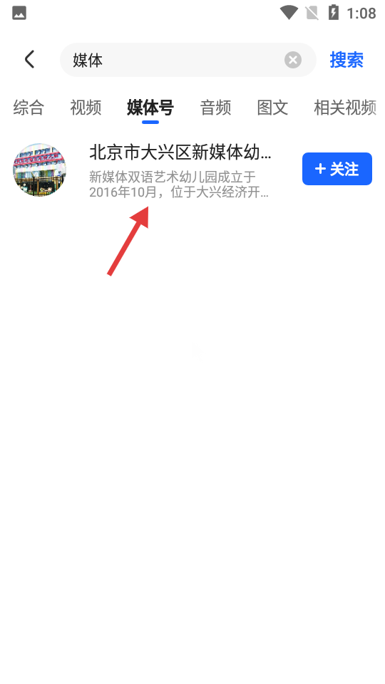 4、进入媒体账号详情页后,点击【+关注】,完成媒体账号关注操作。