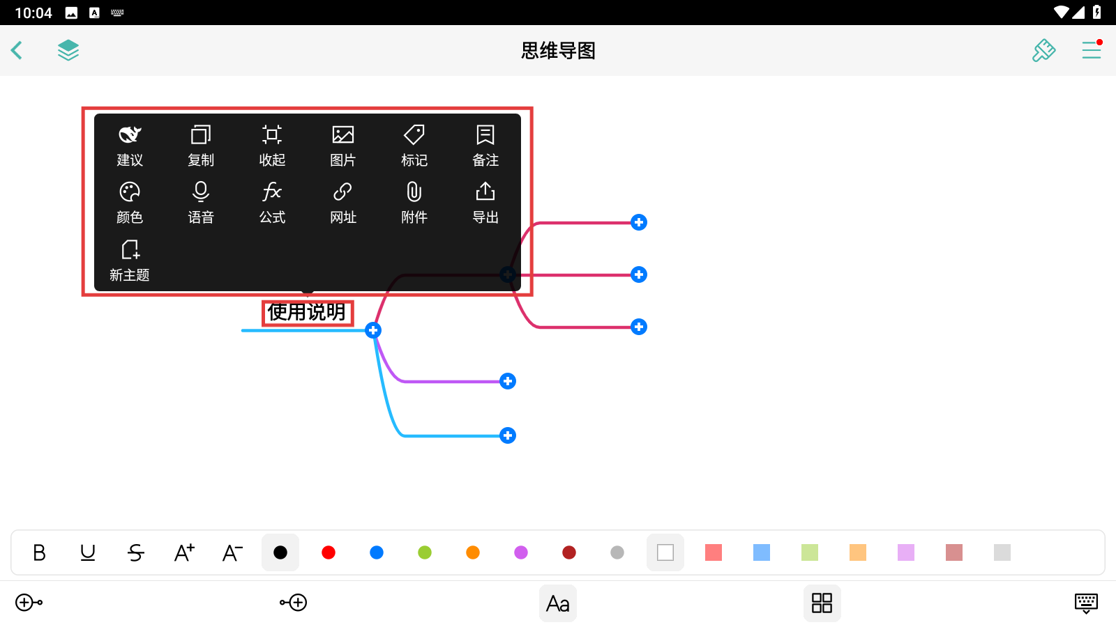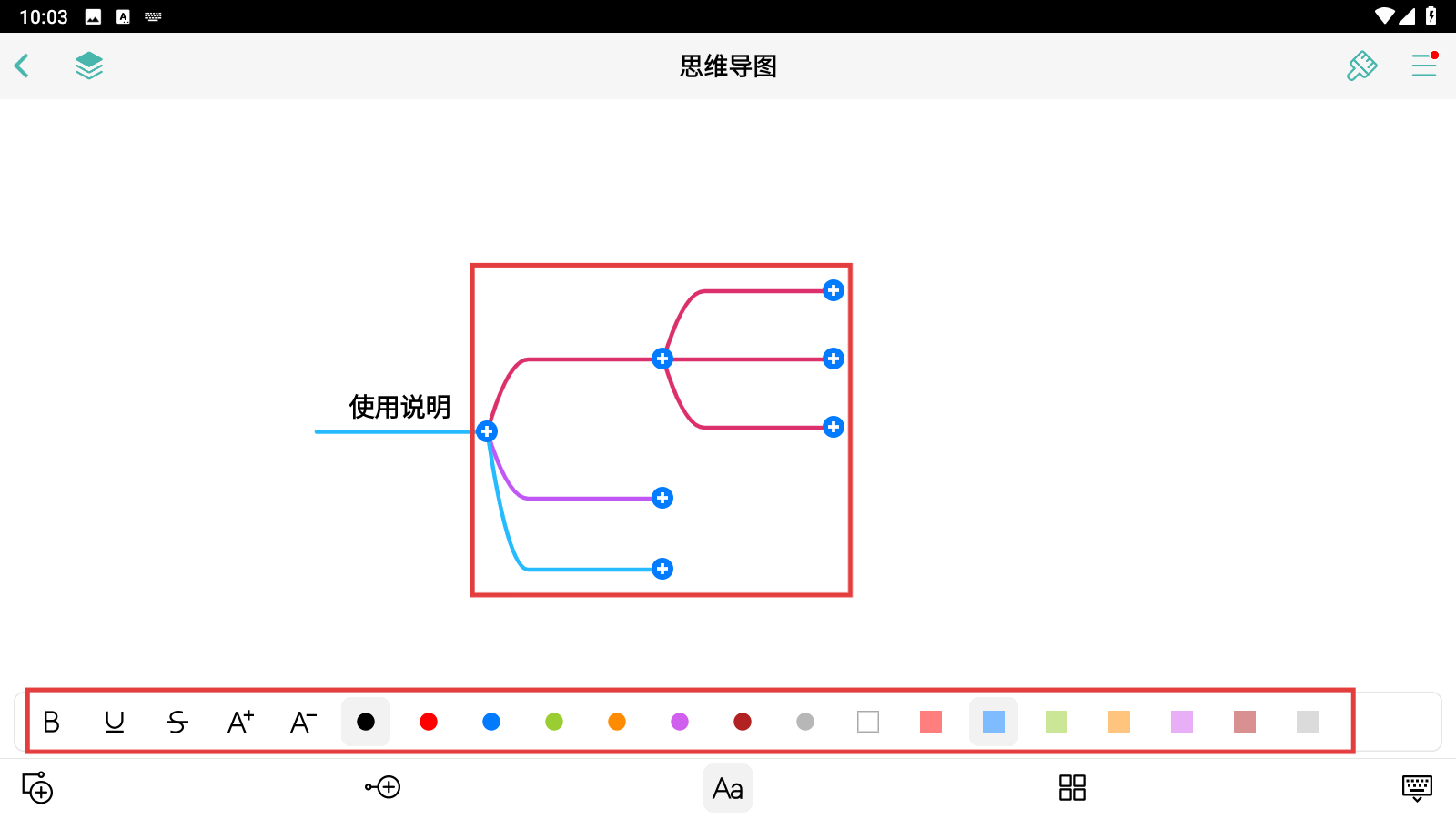 3、添加好分支后,我们能用底部工具调整文字的粗细、大小,还能给分支选择不同的颜色,让导图更清晰美观呢。
