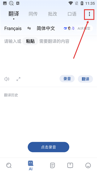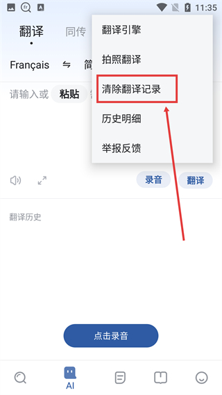 3、点击三点图标后弹出菜单,选择【清除翻译记录】选项,即可触发清除记录的确认弹窗。