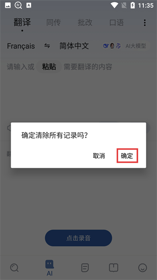 4、在弹出的“确定清除所有记录吗?”弹窗中,点击【确定】按钮,即可完成翻译记录的清除操作。
