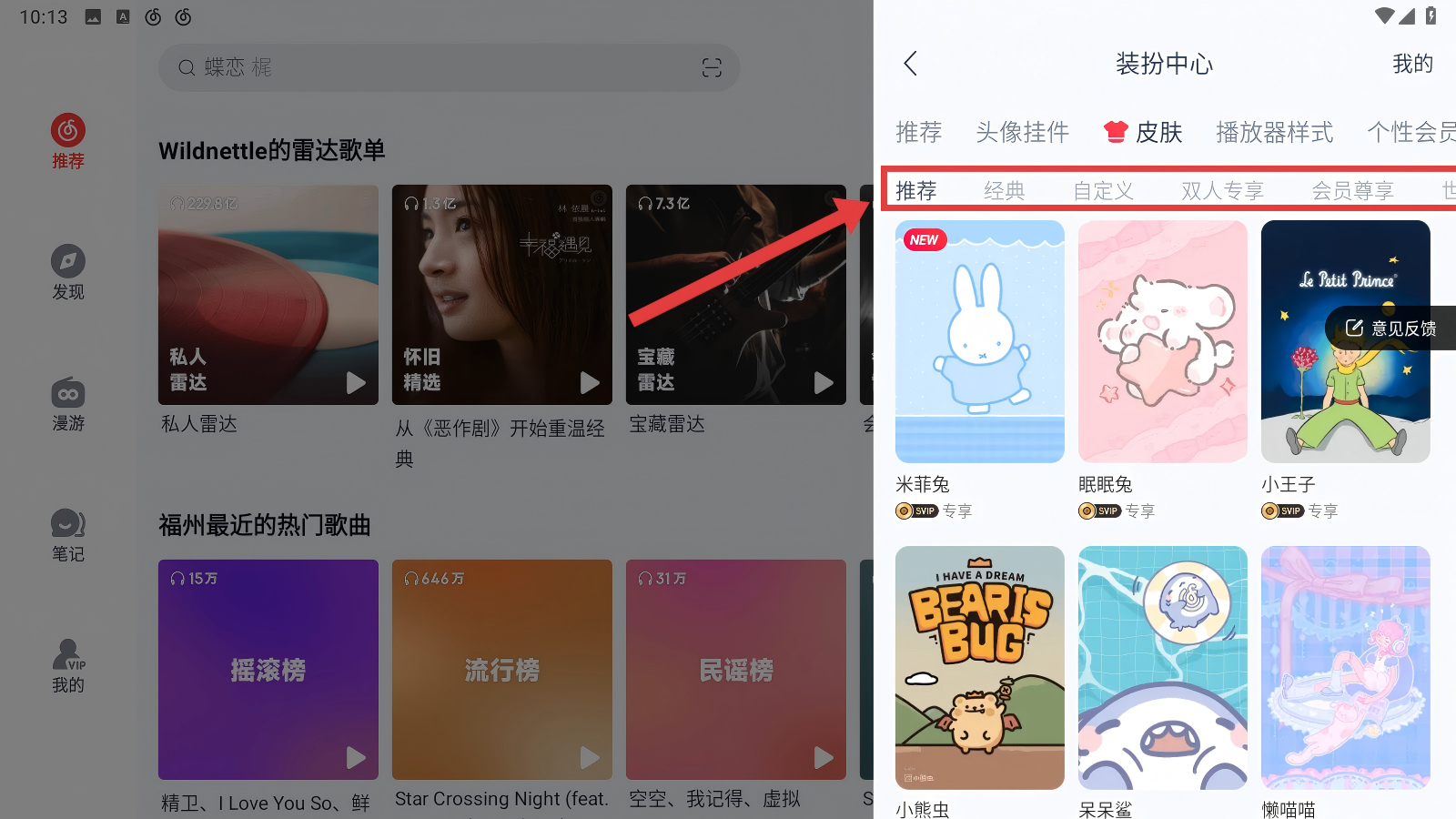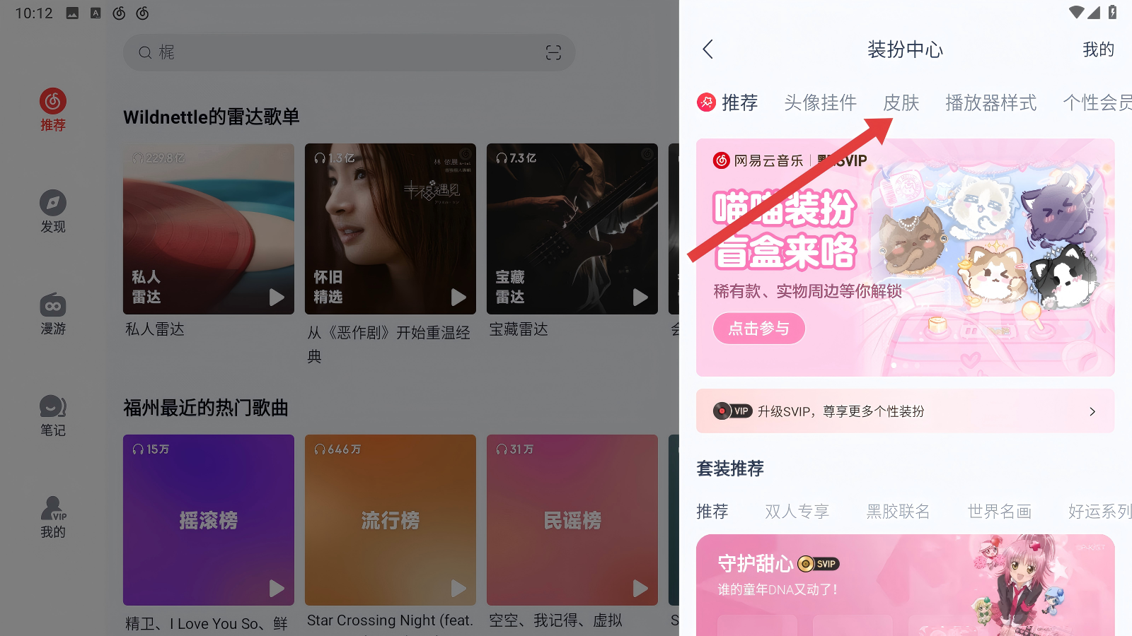 2、到了【装扮中心】,点击顶部的【皮肤】标签,就能看到各种皮肤相关的推荐内容,挑选起来很方便呢。