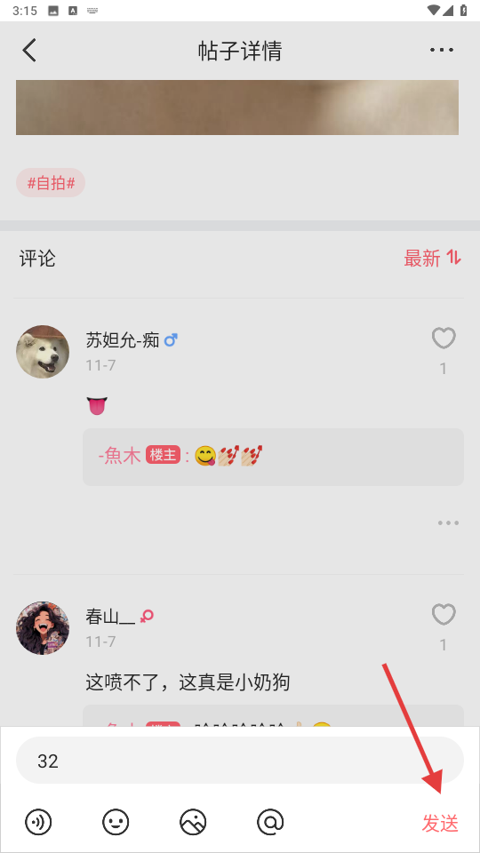 3、进入帖子详情页,点击底部评论输入框,输入评论内容。