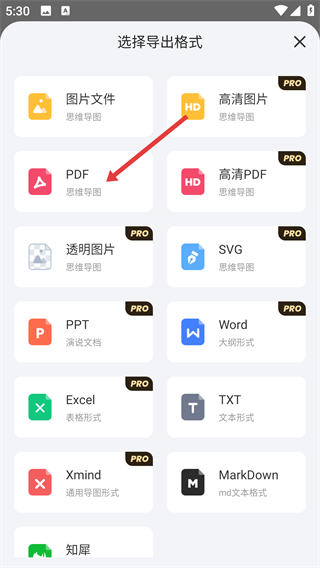 4、在选择导出格式页面,点击【PDF-思维导图】选项,即可将思维导图导出为PDF格式,方便分享和保存哦。