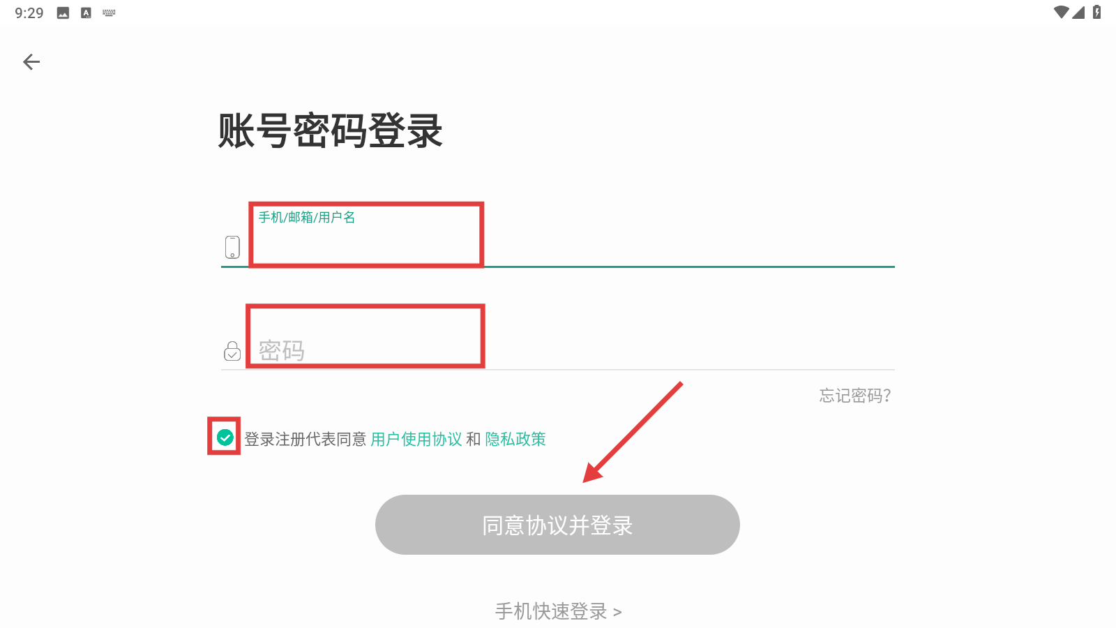 2、若选账号密码登录,依次输入【手机或邮箱或用户名】和密码,勾选协议后点击【同意协议并登录】即可呢。