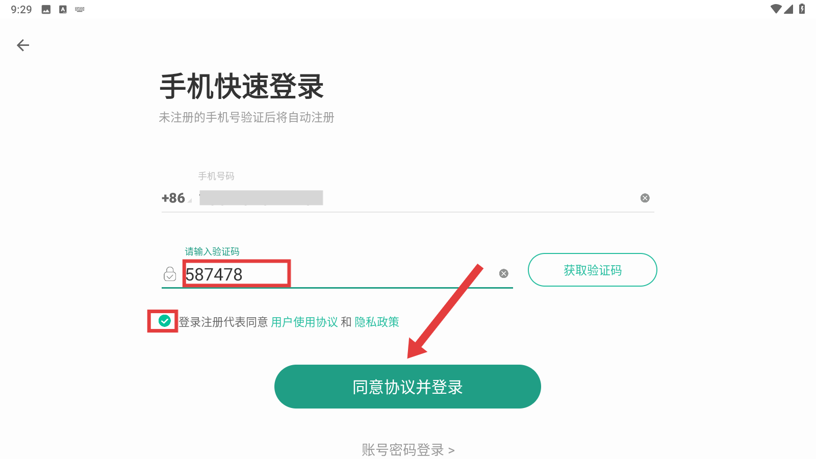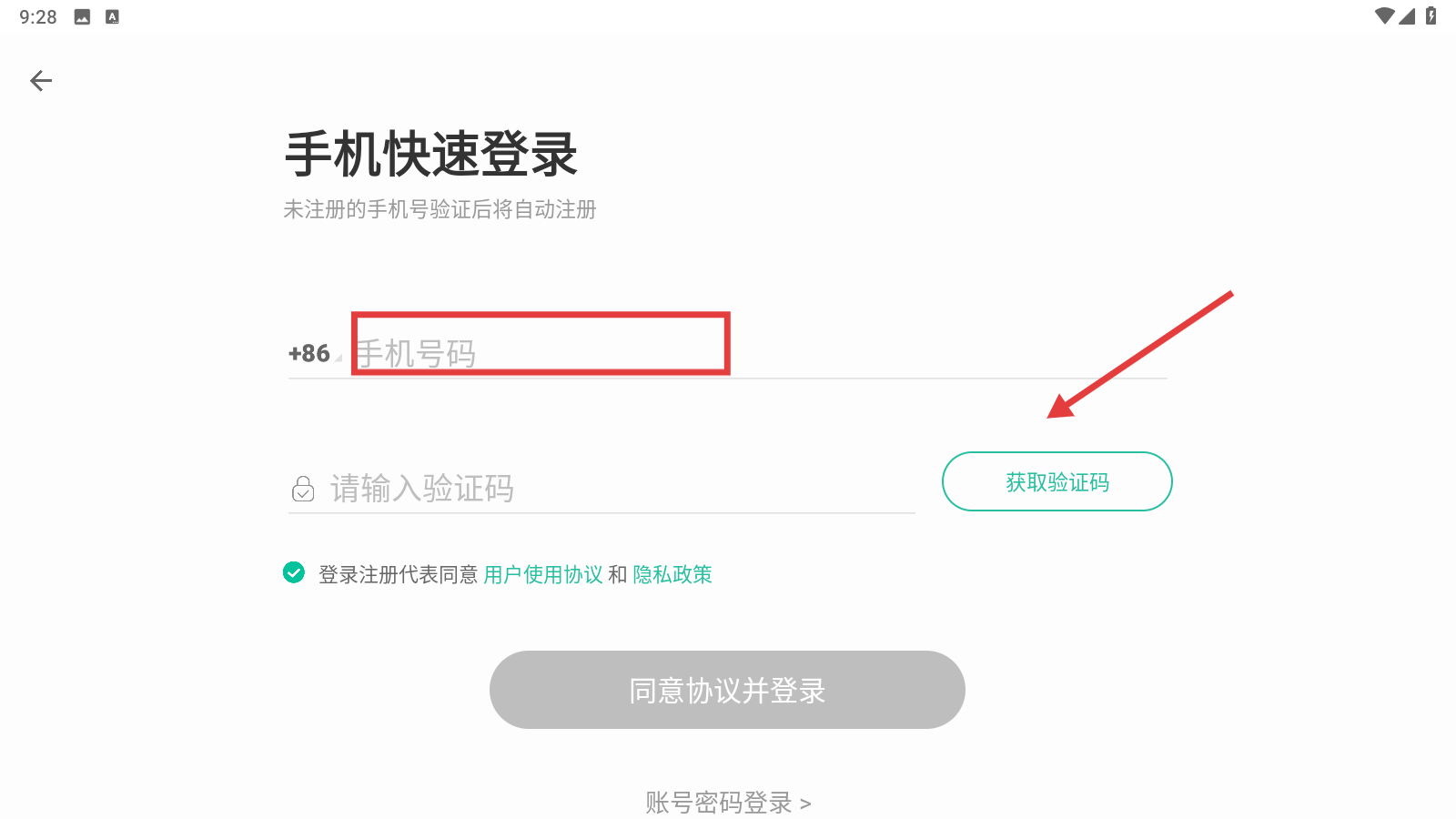 3、选择手机快速登录的话,先输入手机号码,勾选协议后点击【获取验证码】,准备接收验证码哦。