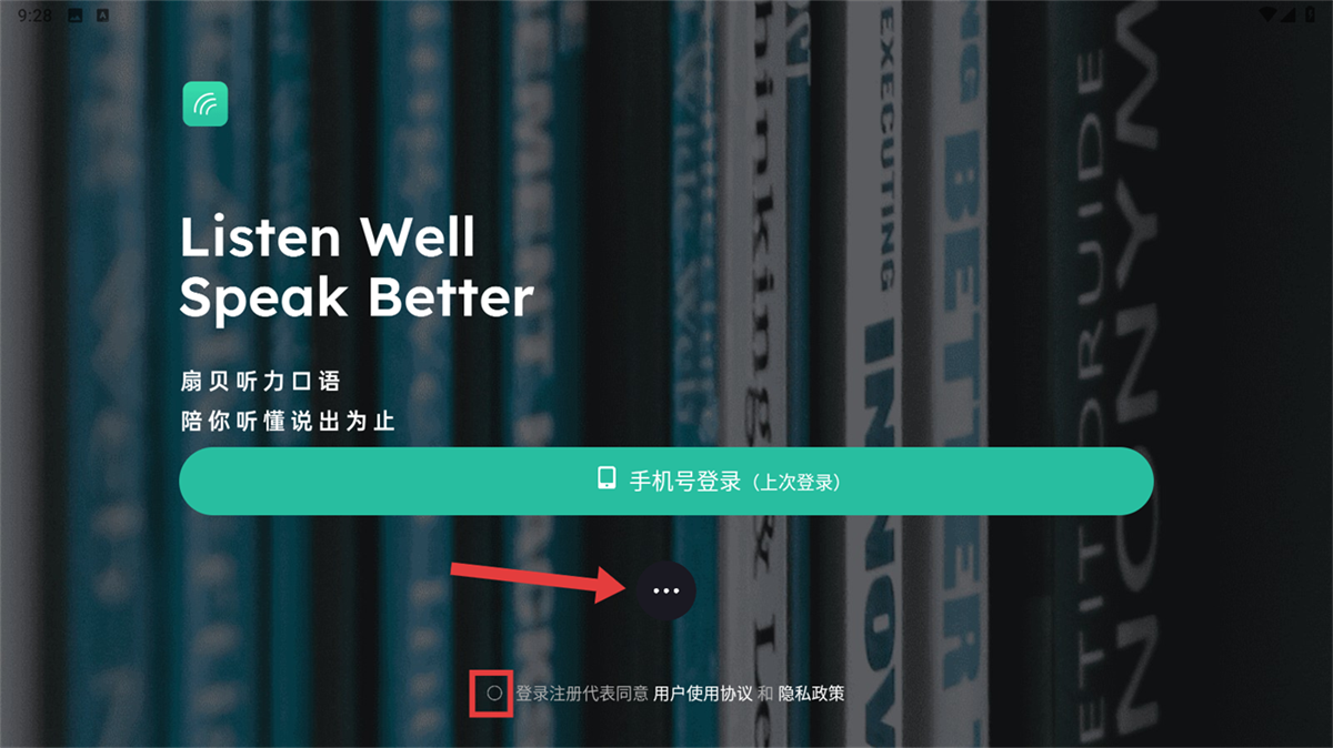 1、打开【扇贝听力口语】,先勾选【登录注册代表同意-用户使用协议和隐私政策】,再点击下方三点图标,选择注册方式哦。