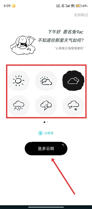 2、在天气选择界面,挑选当天天气,如【多云】,点击【是多云啊】,完成天气记录啦。