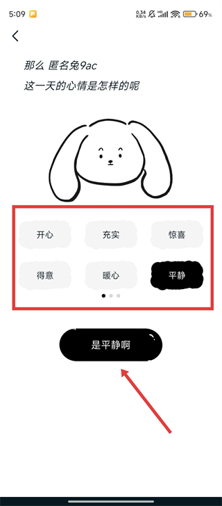 3、接着选择当天心情,如【平静】,点击【是平静啊】,记录心情状态很便捷哦。