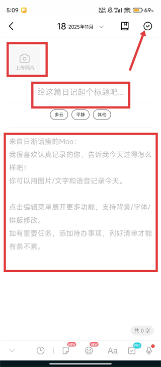 4、在日记编辑页,可【上传照片】、写标题、记录内容,完成后点击右上角对勾,即可保存日记啦。