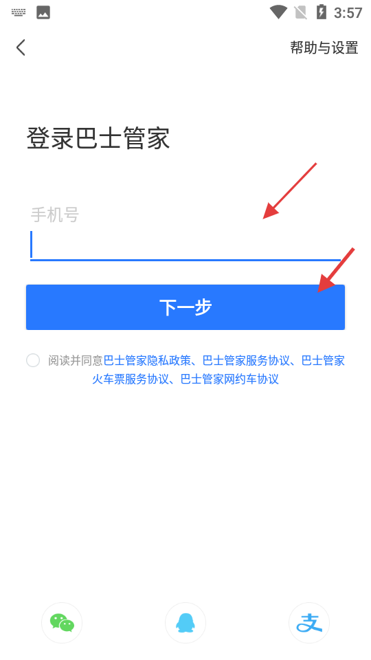 3、在登录界面输入手机号,勾选“阅读并同意巴士管家隐私政策”等协议后点击【下一步】。